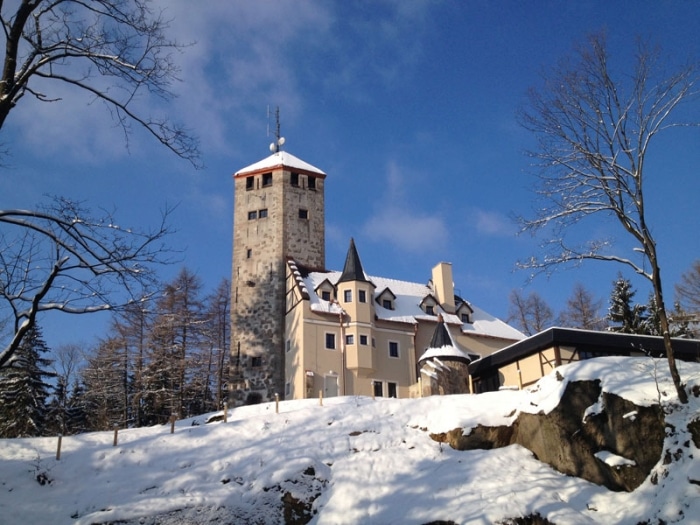 Zvolit jako místo výletu po rozhlednách Lomnici nad Popelkou je určitě dobrá volba, v okolí se nachází tři rozhledny a ta poslední na skokanském můstku je z nich nejnovější. Vznikla během modernizace sportovního areálu a pro její netradiční vzhled posloužila jako základ, kovová konstrukce můstku. Pro vzhled rozhledny se nechal architekt Jaromír Stránský inspirovat tvarem kalicha a stavba tak získala jedinečný vzhled.