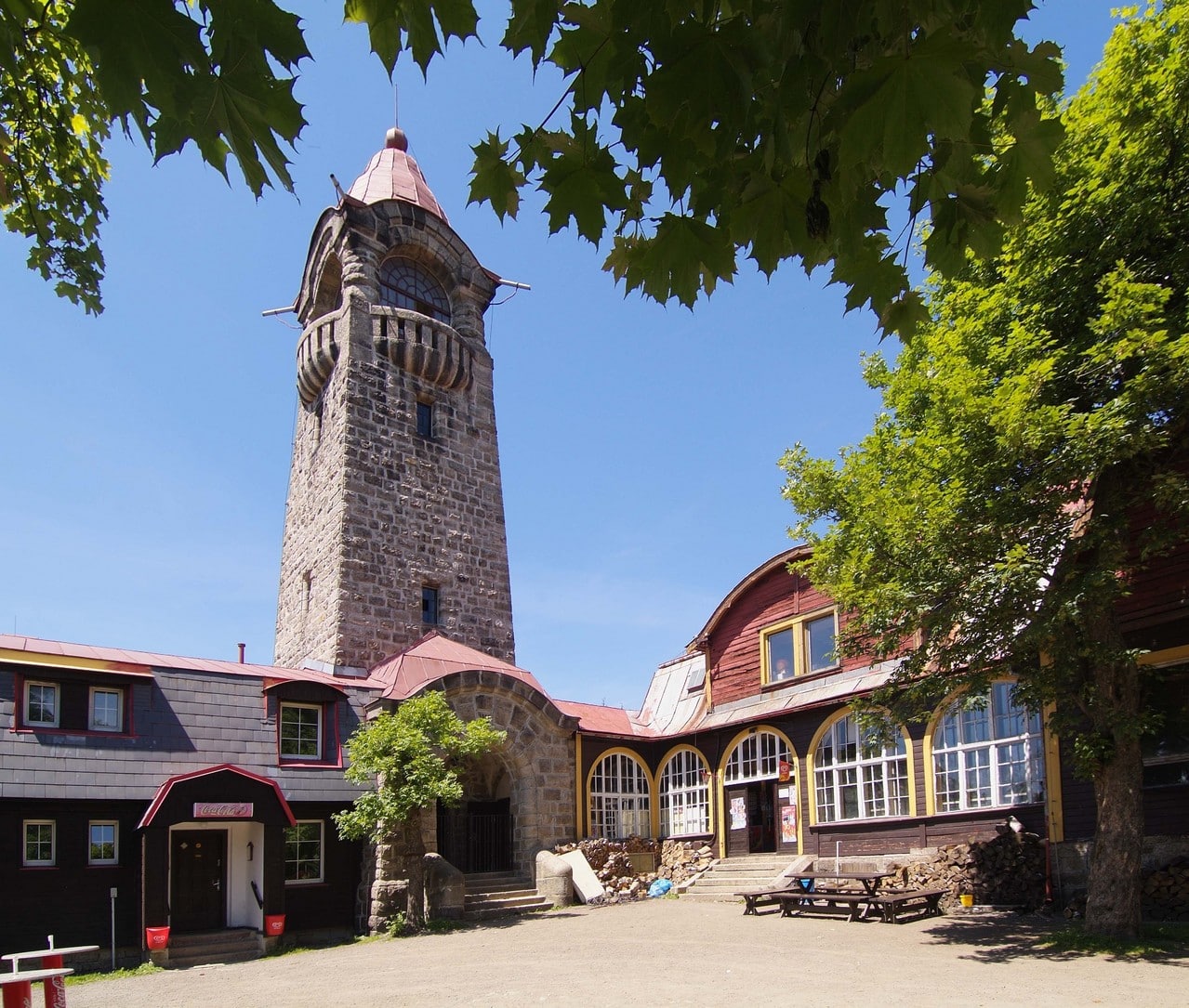 Neobvyklá stavba nad městem Liberec vznikla v letech 1900 – 1901, kdy zdejší textilní magnát baron Heinrich Liebig pověřil architekta Josefa Smitze vypracováním projektu na stavbu, která by v sobě zahrnula restauraci a rozhlednu. Výška věže je 20 metrů, ke vchodu do restaurace vede devět kamenných venkovních schodů. Z podlaží restaurace dále vede vstup do věže, ve které je umístěno lomené dřevěné schodiště se 107 stupni.